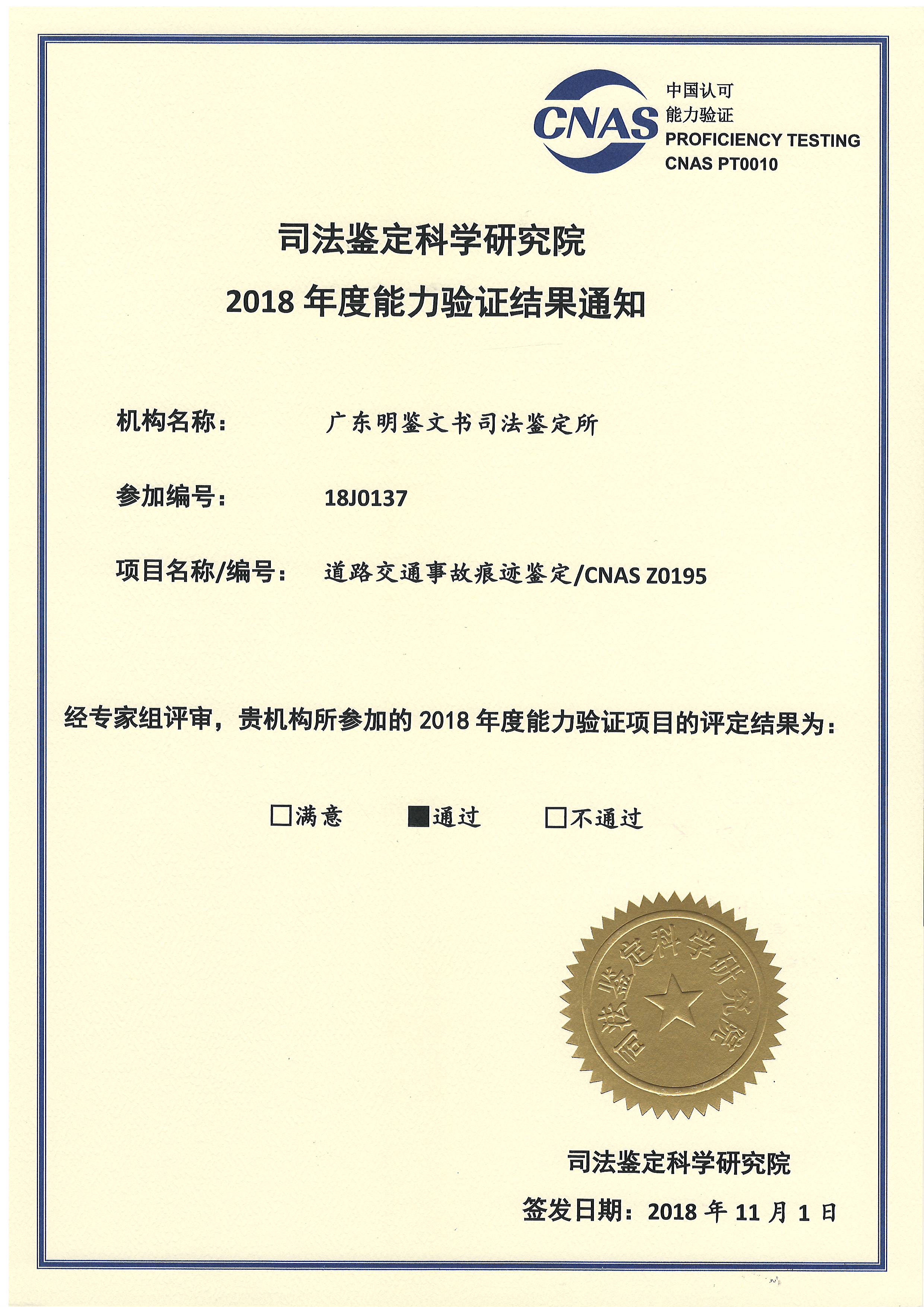 2018年能力验证结果通知(交通事故痕迹鉴定)