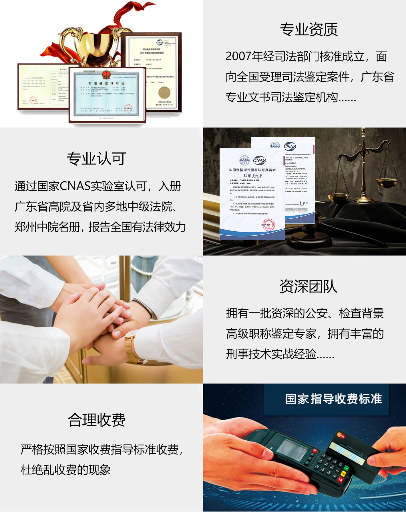 关于我们 广东明鉴文书司法鉴定所于2007年经司法厅核准设立的司法鉴定机构,面向社会提供文书司法鉴定(文件制作时间鉴定仅限于使用国家标准方法)、痕迹司法鉴定服务。根据司法部《司法鉴定机构登记管理办法》的规定,取得司法鉴定许可证,许可证号:“440107149”。 广东明鉴文书司法鉴定所的司法鉴定人员多名,均是来自公安战线的资深专家,执业人员大都具有30多年的鉴定经验。“做最专业的技术团队,采用现代科学技术,提供最专业的文书鉴定技术服务”是广东明鉴文书司法鉴定所鉴定人共同的奋斗目标。广东明鉴文书司法鉴定所面向全国受理各类诉讼及非诉讼案件,树立“服务大局、执业为民”的理念和“客观公正、科学规范”的社会形象,坚守诚信为服务宗旨,坚持“科学严谨、实事求是”的服务准则,为社会各界处理刑事、行政、民事等各类案件提供了科学准确的依据,赢得广大群众的信任和支持,在社会各界享有较高的信誉。 ...